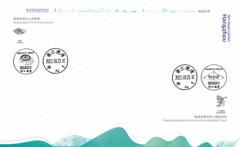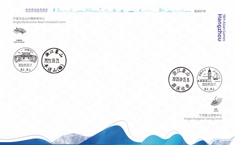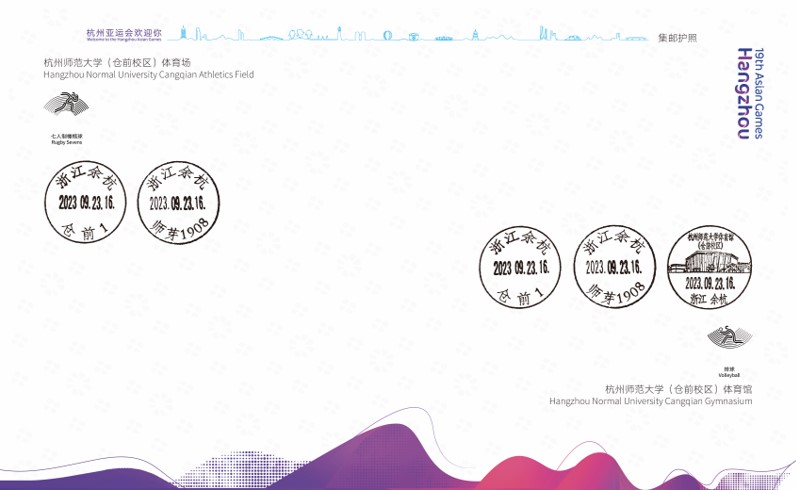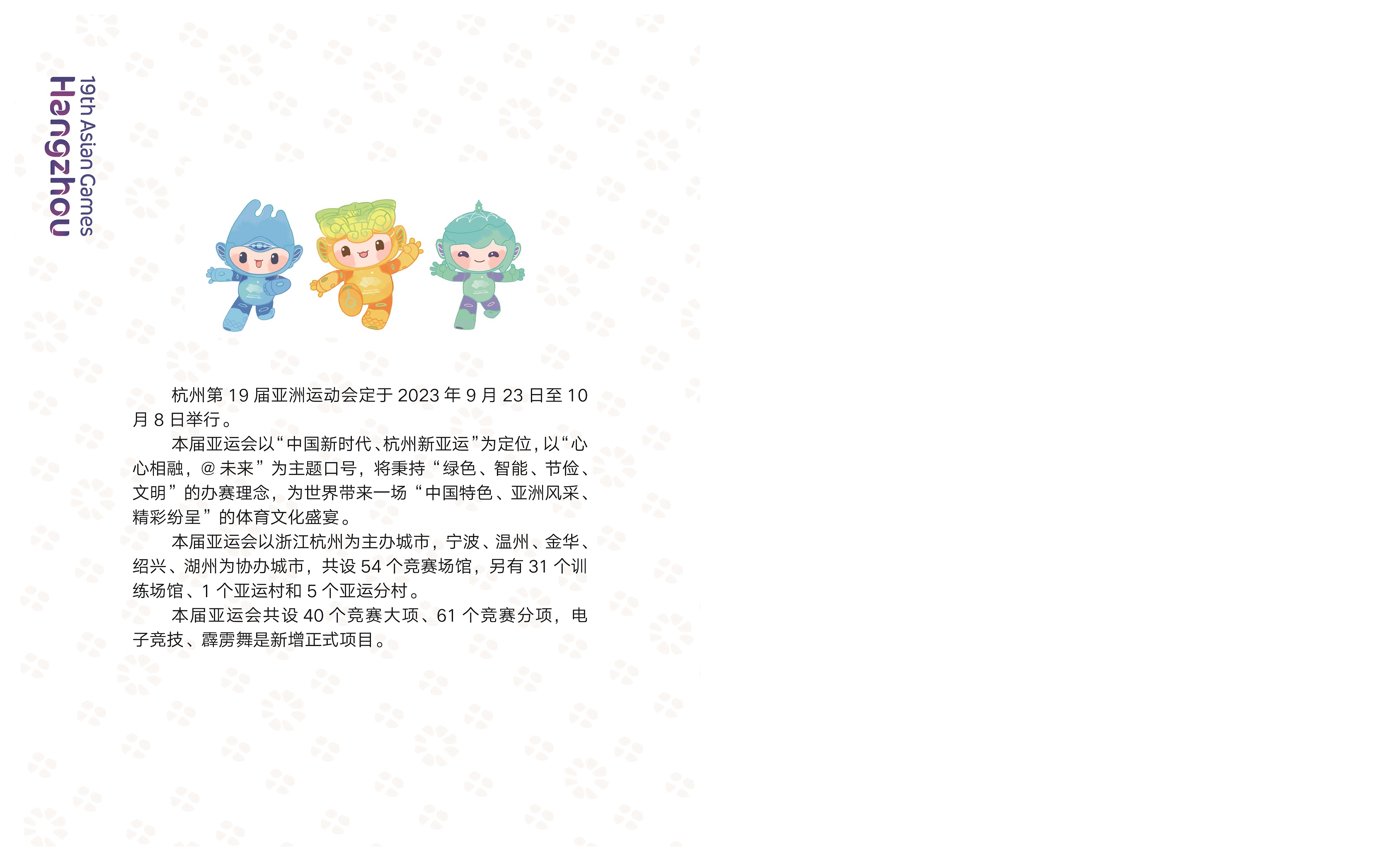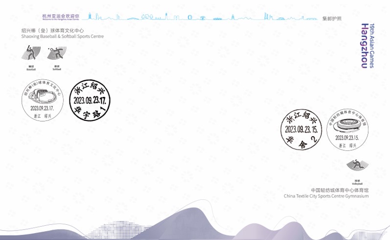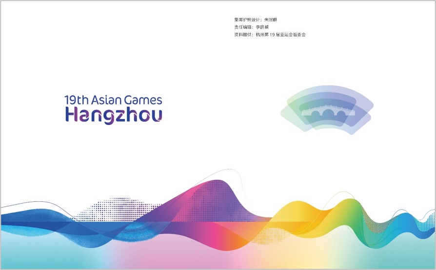 《杭州第19届亚洲运动会》集邮护照开幕日邮戳珍藏版包含各赛区(城市)介绍以及54个竞赛场馆的中英文名称、对应竞赛项目的体育图标,各赛区(城市)页使用“淡妆浓抹”官方色彩体系中的一种色彩。