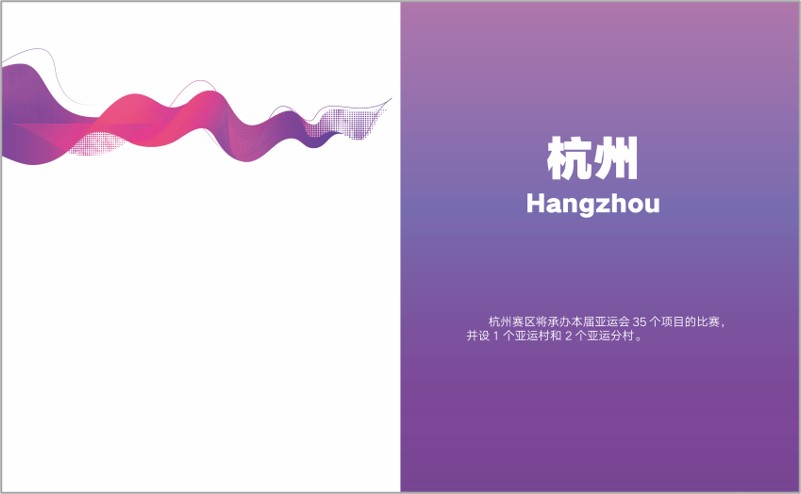 本产品依托杭州亚运会会徽“潮涌”、体育图标、核心图形“润泽”、色彩系统“淡妆浓抹”、吉祥物“江南忆”、主题口号“心心相融,@未来”等元素,介绍杭州亚运会基本情况、6个主协办城市赛区概况,展示54座竞赛场馆中英文名称及其对应的61个体育项目分项。其中六大赛区巧妙对应色彩体系“淡妆浓抹”的六大色彩,让您切身感受到江南的风韵。