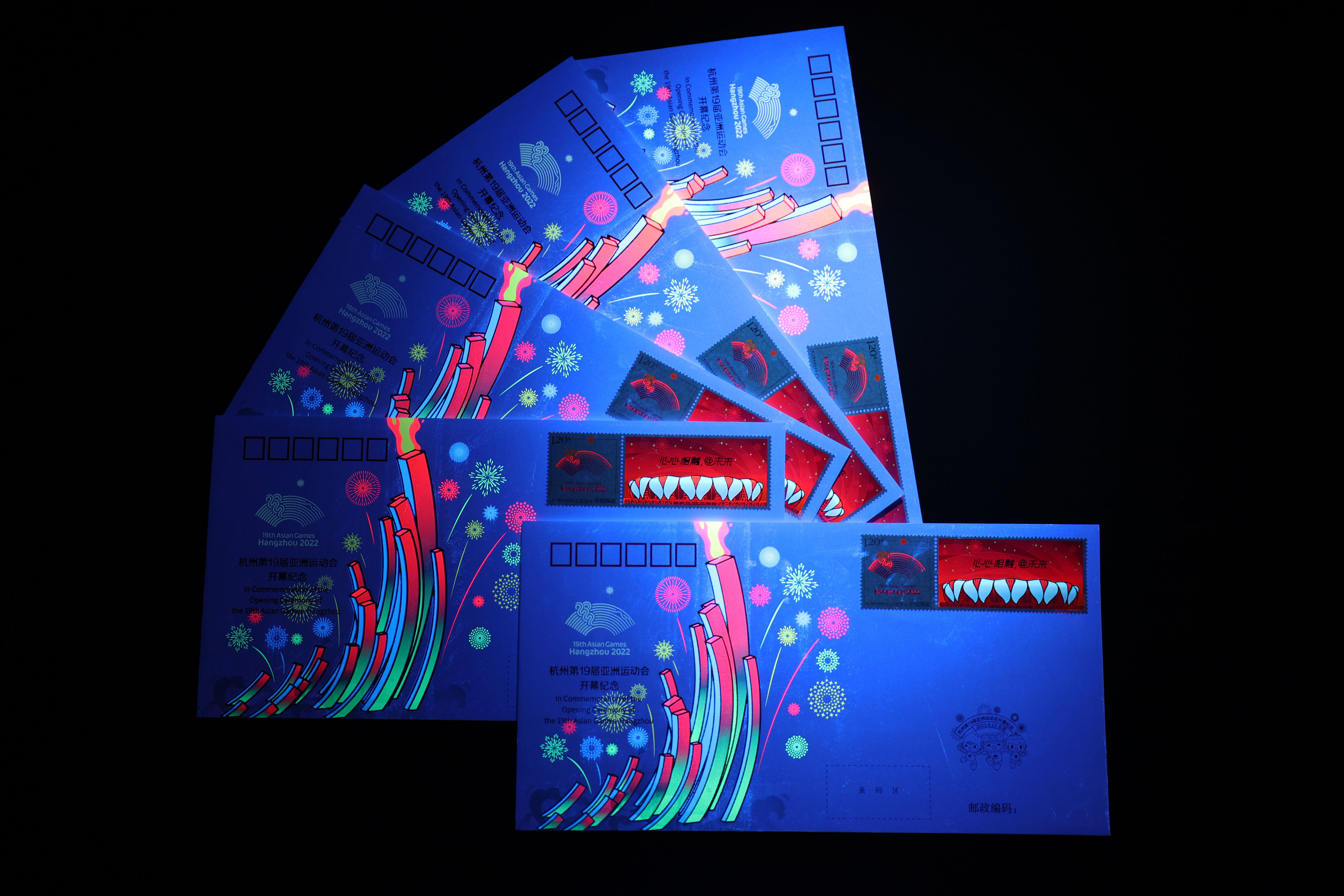 紫外灯下,纪念封隐藏的荧光图案更加绚丽夺目,主体图案部分突出表现被以数实融合方式点燃的主火炬“钱江潮涌”和涌动的火焰,邮票主图的会徽“潮涌”图案出现在纪念封中英文名称之上,成为点题的核心元素。19朵多彩的数字烟花在天空中绽放,照亮钱塘江畔的夜空。