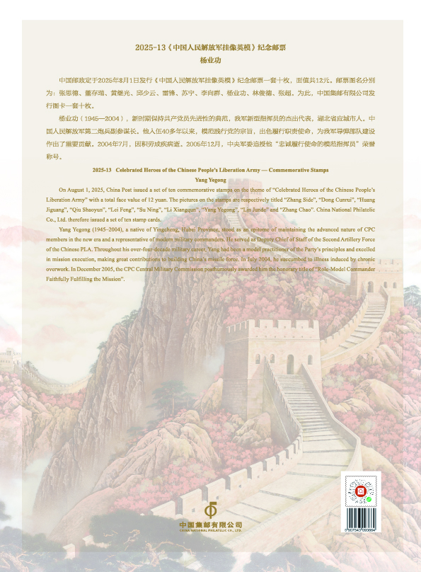 中国集邮有限公司于2025年8月1日发行《中国人民解放军挂像英模》图卡