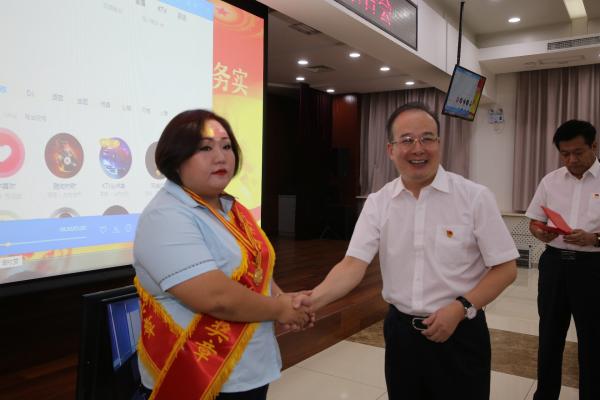 市分公司副总经理谢文超宣读了对河北区分公司大江里网点负责人马慧等6位先进劳模的表彰决定。陆学鹏总经理和纪委书记刘承发向2017年天津市“五一”劳动奖章获得者马慧颁发奖牌和证书,表彰她在“海燕行动”以及网点转型发展中作出的突出贡献。