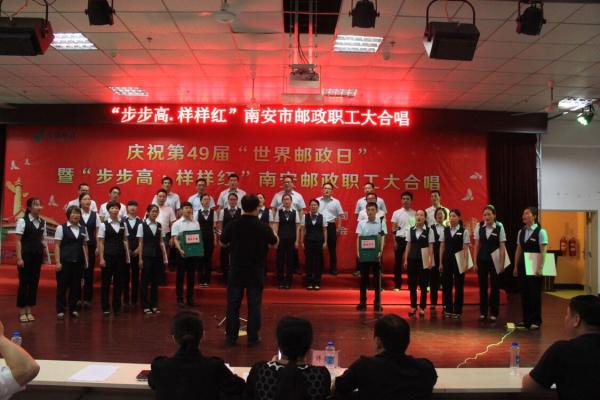 为了鼓舞士气,弘扬正气,把全体职工的思想统一到企业改革和发展上来,经过一个多月的筹备,10月10日晚,南安分公司隆重举行了庆祝第49届“世界邮政日”暨“步步高·样样红”南安邮政职工大合唱比赛。比赛以《步步高》为大合唱统一歌曲,来自各部门、支局所的21支代表队纷纷发挥团队的智慧和力量,在队形、唱法及服装上进行创新创意,充分展现属于自己的风采和特色,各支代表队队员身着统一服装,以整齐的队列、饱满的精气神和高亢激昂的歌声,讴歌邮政企业的奋斗历史,展现出南安邮政新时代、新作为的正能量的一面。经过一番激烈的角逐,最终有10支代表队胜出,分别获得一、二、三等奖,其中集邮与文化传媒部获得本次比赛冠军。