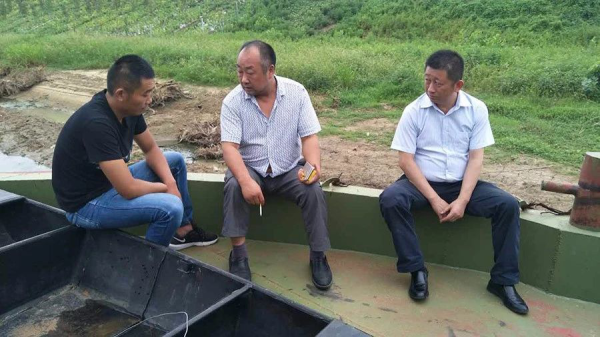 他(左一)前往江苏,实地走访船舶贷款客户