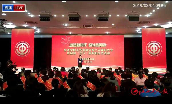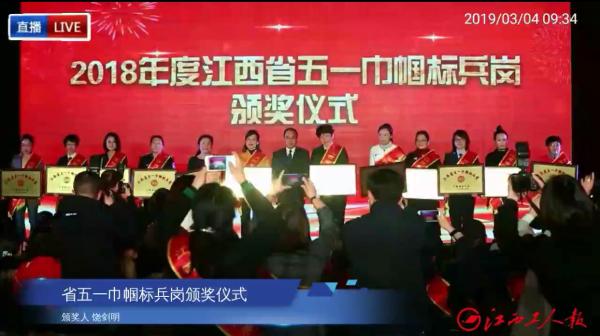 3月4日上午,在“三八”国际妇女节前夕,江西省总工会在南昌举办了“追梦新时代、奋斗最美丽”全省女职工先进集体和个人表彰大会暨纪念“三八”国际妇女节活动。江西省邮政系统1个女职工集体和3名个人获表彰,分别是中国邮政集团公司宜春市分公司金融业务部荣获2018年度“江西省五一巾帼标兵岗”荣誉称号,中国邮政集团公司新余市渝水区分公司总经理蒋小蓉、中国邮政集团公司抚州市分公司金融业务部经理卜燕云、中国邮政储蓄银行股份有限公司贵溪市支行小企业客户经理何瑶分别荣获2018年度“江西省五一巾帼标兵”荣誉称号。