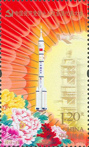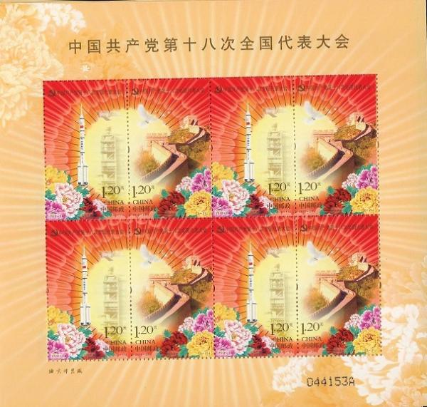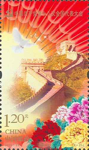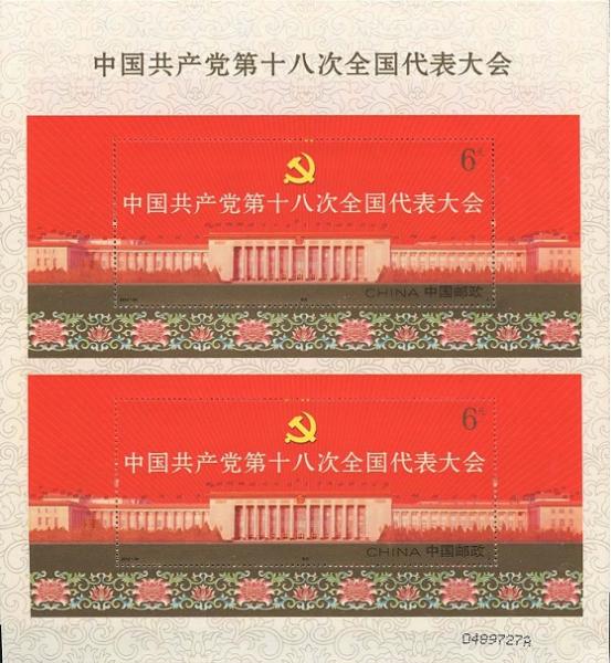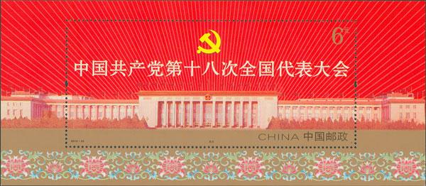 中国邮政2012年11月8日发行《中国共产党第十八次全国代表大会》纪念邮票1套2枚,小型张1枚。