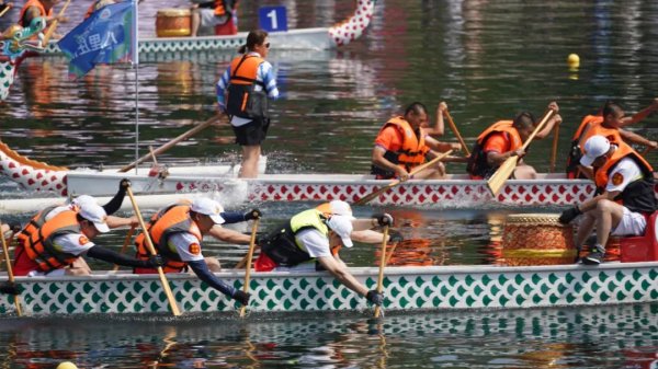 鼓手在前,有节奏地打起鼓点,舵手发力把握方向,桨手们快速有力划起船桨,龙舟快速向前。