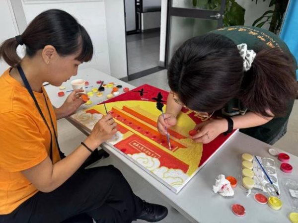 “你负责这个位置”“这个地方我们要结合邮政元素,突出国庆举国欢庆的色调”……各小组在愉悦的氛围中展开了激烈的创作比拼。他们时而专注凝视,时而欢声笑语,用那平日里因处理邮件而略显粗糙的双手,满怀深情地细致描绘自己的作品。