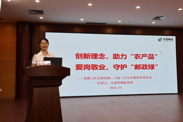 本次活动由全国劳模、全国五一劳动奖章获得者陈春鸿同志主讲。会上,陈春鸿同志发表了题为《创新理念,助力“农产品”;爱岗敬业,守护“邮政绿”》的宣讲,就党的二十届三中全会的深远意义、中央重要讲话精神及全会《决定》进行了全方位的讲解。