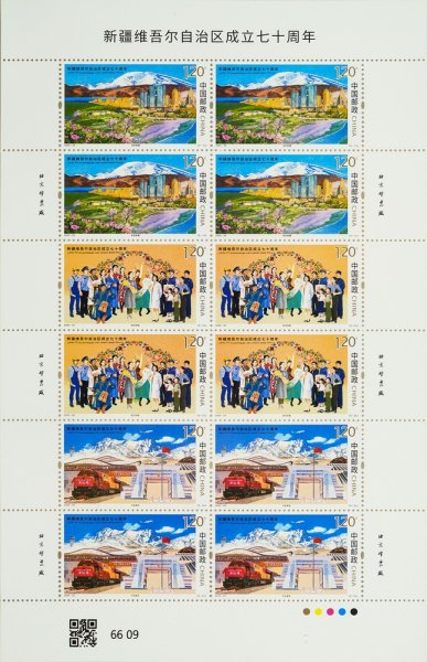中国邮政定于2025年9月21日发行《新疆维吾尔自治区成立七十周年》纪念邮票1套3枚,邮票图案名称为:美丽新疆、团结和睦、开放高地。全套邮票面值3.60元,计划发行数量为490万套。