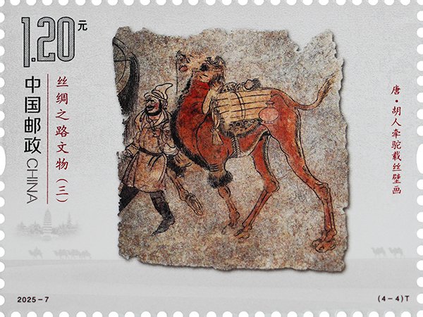 胡人牵驼载丝壁画出土于河南省洛阳市安国相王孺人唐氏墓,现藏于洛阳古墓博物馆。壁画绘制在唐氏墓墓道西壁,正中一匹高大雄健的骆驼昂首挺胸、抬蹄甩尾、阔步前进。骆驼背上,是捆扎好的丝绸卷和瓶子。前面牵缰绳的西域人高鼻梁、络腮胡,头戴尖帽,身着翻领长衫,脚蹬黑色高靿靴,正迈步牵驼前行。该壁画生动再现了各国商人来到丝绸之路的东方起点之一洛阳,装载丝绸西行走上丝绸之路的场景,客观地反映了唐代的社会场景和世俗风情,讲述着文明交流互鉴的故事。邮票结合逆向上光和哑沙工艺,既展现出壁画沧桑的历史变迁,又突出壁画中人物、饰物、动物等不同的色彩效果,赋予其独特的艺术气质。