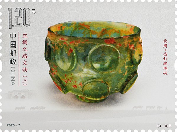 凸钉玻璃碗出土于宁夏固原市南郊的北周李贤夫妇合葬墓,现藏于宁夏回族自治区固原博物馆。该碗为直口,矮圈足,通体透明,呈碧绿色,外壁饰以14个凸起的圆形装饰两周,上下错位排列。其内壁光洁,外壁有薄层的金黄色分化物,其材质属钙钠玻璃,含有较多其它矿物质,该形制在萨珊时期的伊朗高原十分流行。邮票将特种光油和三维浮雕起凸组合应用,玻璃碗晶莹剔透的质感和立体感跃然纸上。固原作为丝绸之路西北咽喉门户,见证了东西方文化交流交融,提供了考察当时东西方贸易极为重要的资料。