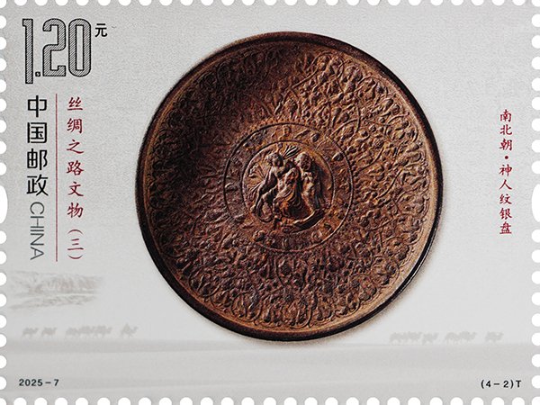 中国邮政定于2025年5月18日发行《丝绸之路文物(三)》特种邮票1套4枚,邮票图案名称为:汉·“五星出东方利中国”锦护膊、南北朝·神人纹银盘、北周·凸钉玻璃碗、唐·胡人牵驼载丝壁画。全套邮票面值4.80元,计划发行数量590万套。