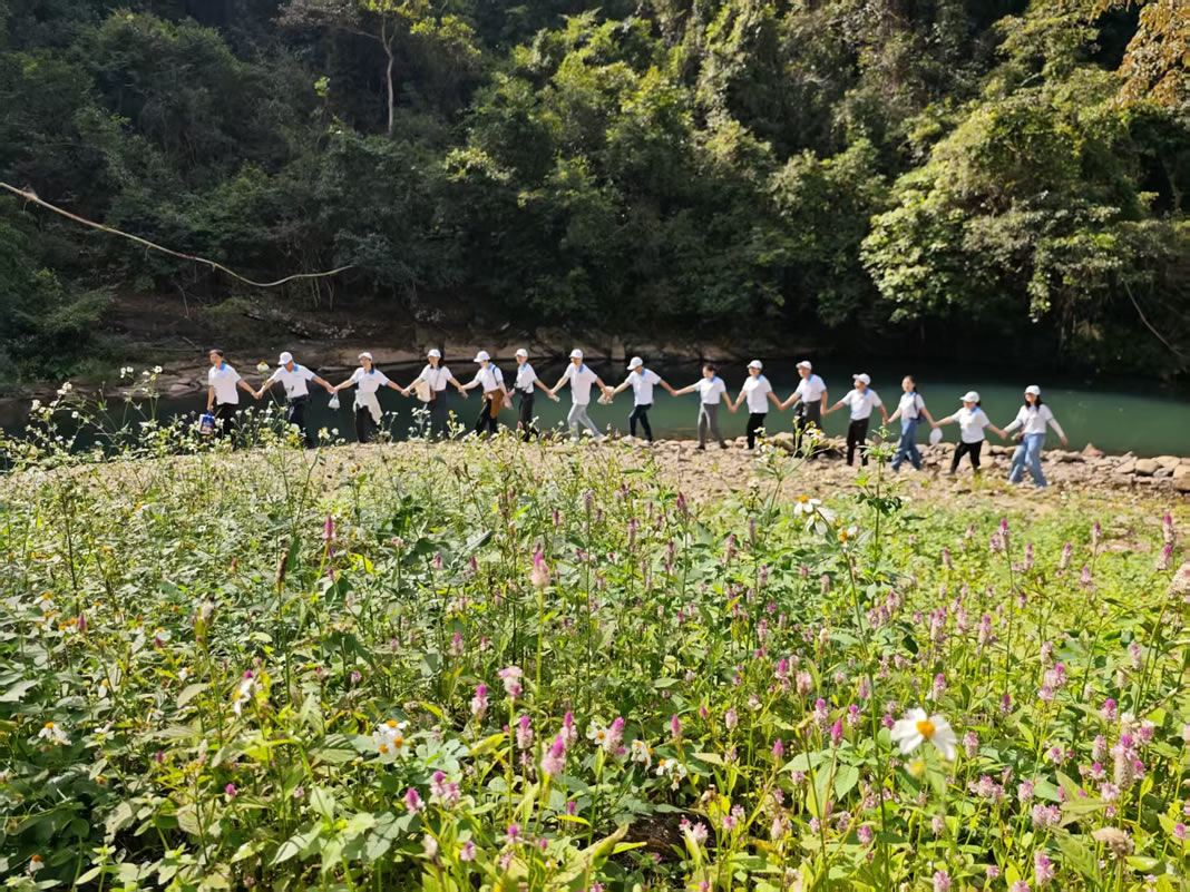 深秋的桂山,层林尽染,泉流淙淙,斑斑红叶点缀于翠色之间,步道蜿蜒,秋韵如画。队员们沿山径有序前行,途中有陡坡攀登时的相互扶持,也有平缓路段中的轻松畅谈。欢声笑语与山间清风相和,形成一道流动的风景。